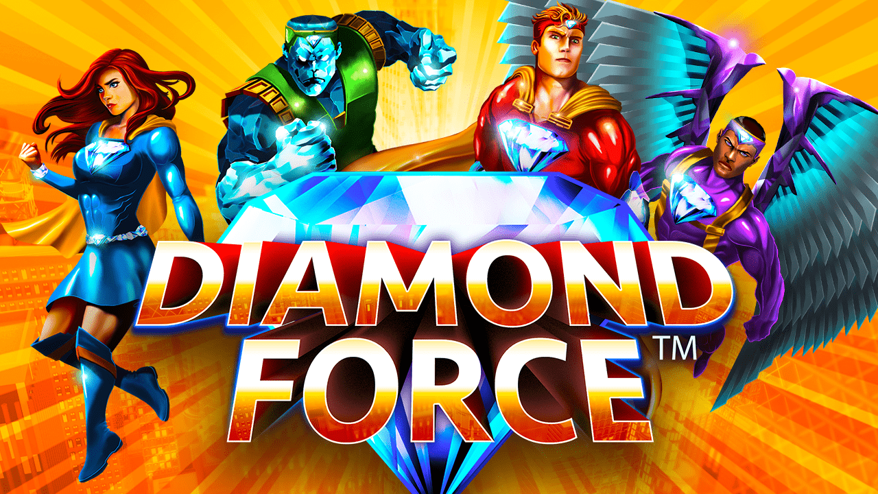 Diamond Force™ features four superhero characters, each with a colourful symbol and special abilities, that spring into action during the Team-Up Feature and Team-Up Bonus Spins! Featuring Team-Up Reels™, watch as full stack symbols combine into new reels, full of credit awards and multipliers that can produce heroic wins! Land a full stack scatter symbol, along with at least two heroes, and enter the action-packed Team-Up Bonus Spins with the ability to re-trigger!